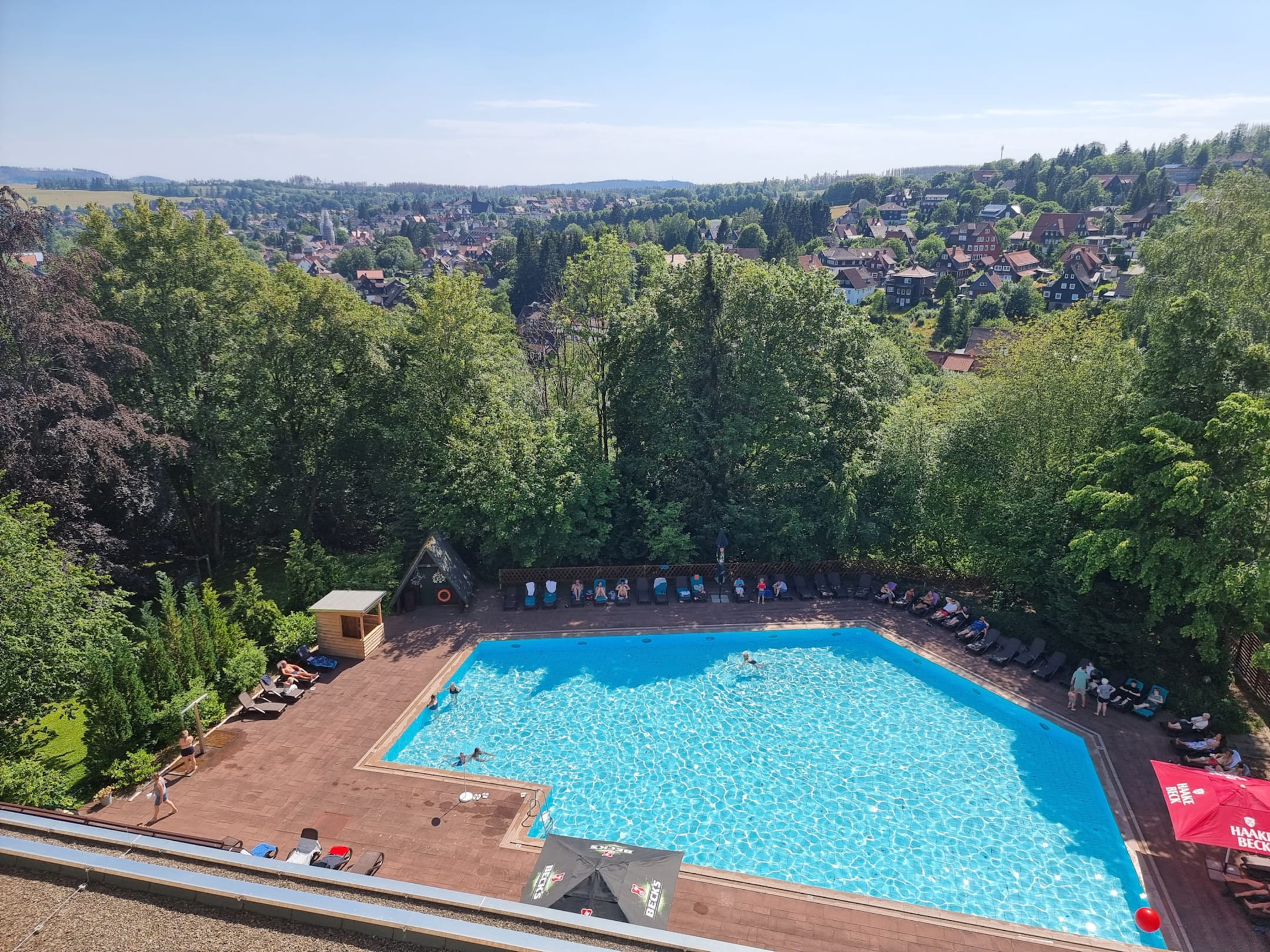 Blick auf den Outdoor Pool und Braunlage