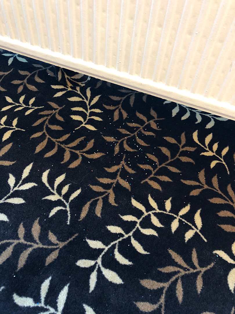 GastroDiese Streusel lagen über mehrere Malzeiten hinweg auf dem Teppichboden im Restaurant. Es wurde hier nicht regelmäßig gereinigt.