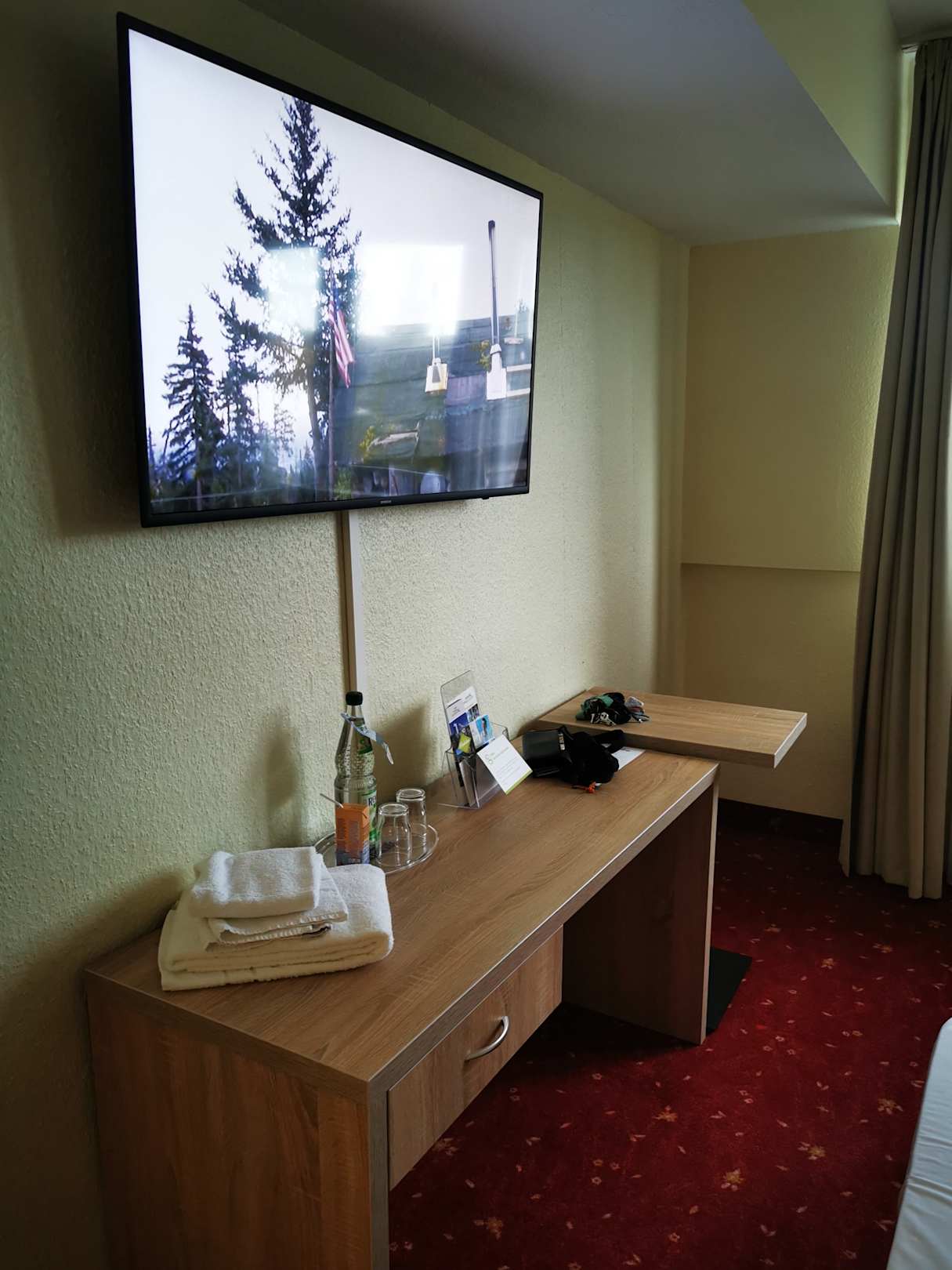 Fernseher mit Schreibtisch und daneben ein Tisch zum verschieben.