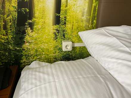 ZimmerDas Elternbett wurde einfach verschoben, damit ein Kinderbett Platz hat. Sicherheit? Den Kopf direkt unter der Steckdose?