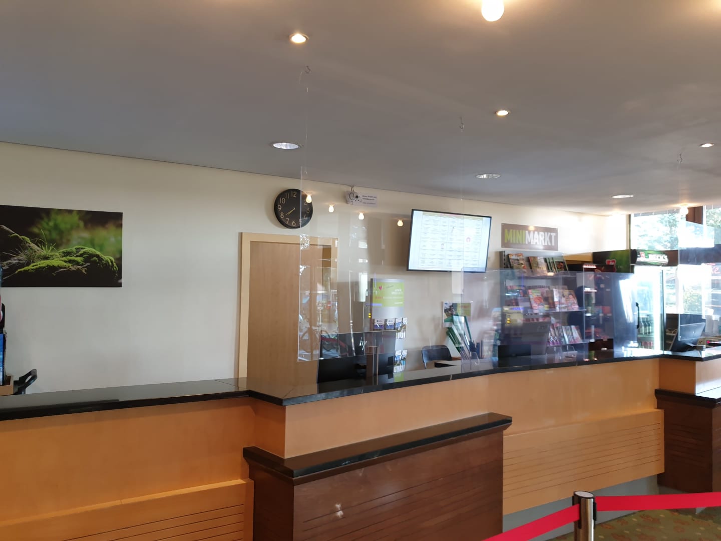 LobbyRezeption in Coronazeiten mit Plexiglas, Desinfektion und Fibermessung am EIngang