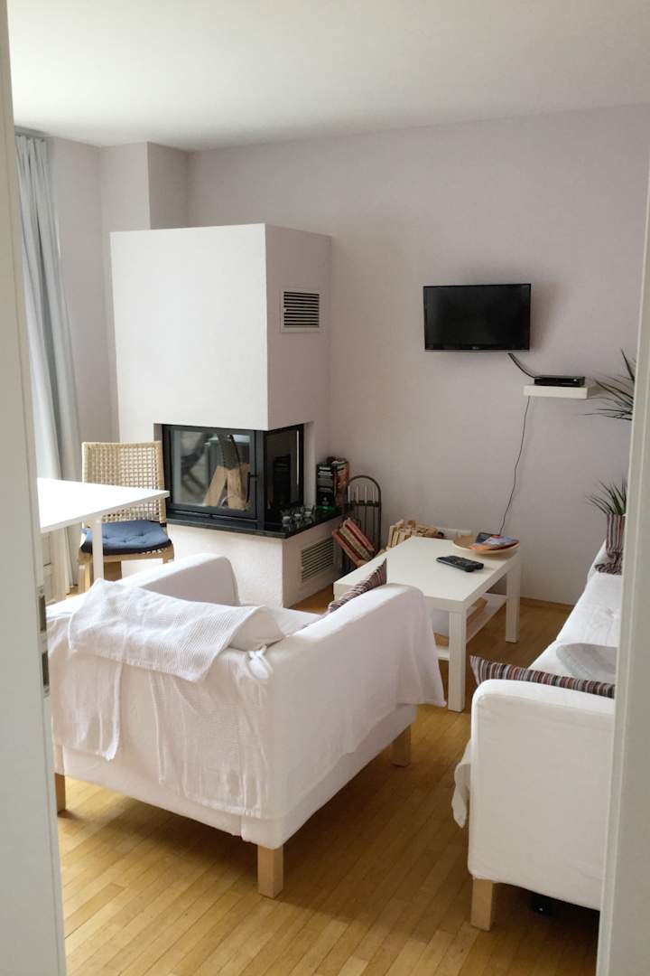 Wohnraum mit Kamin, TV, Sofa, Sessel, Esstisch