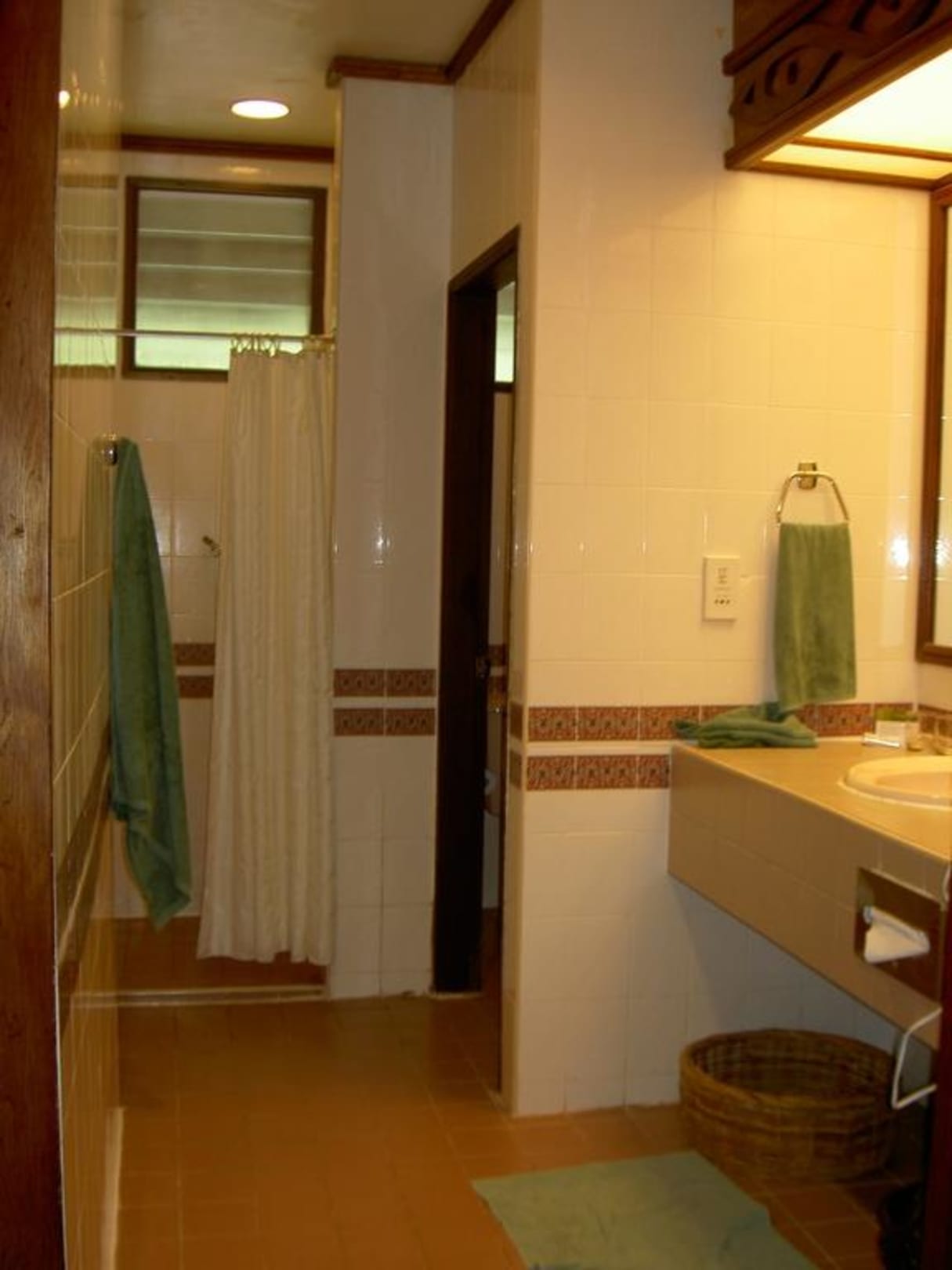BadezimmerRechts ist das Waschbecken, geradeaus die Dusche und hinterm Waschbecken geht´s rechts in die Toilette (abgeteilter Raum).