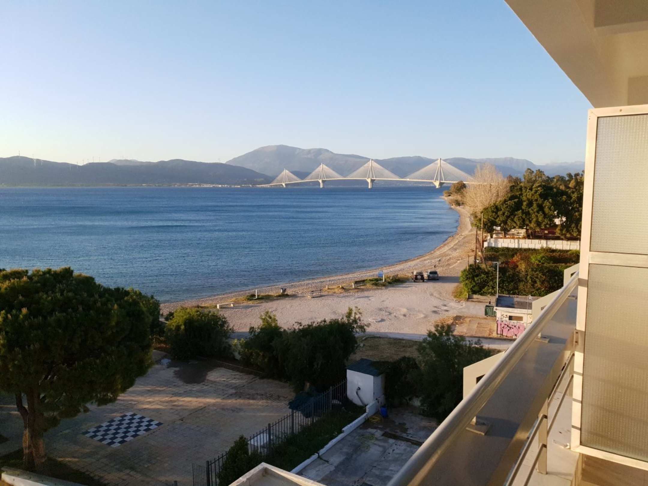 Blick vom Zimmerbalkon auf die Rio-Antirio-Brücke über die Meerenge zwischen dem Golf von Korinth und dem Golf von Patras und auf den Strand vor dem Hotel