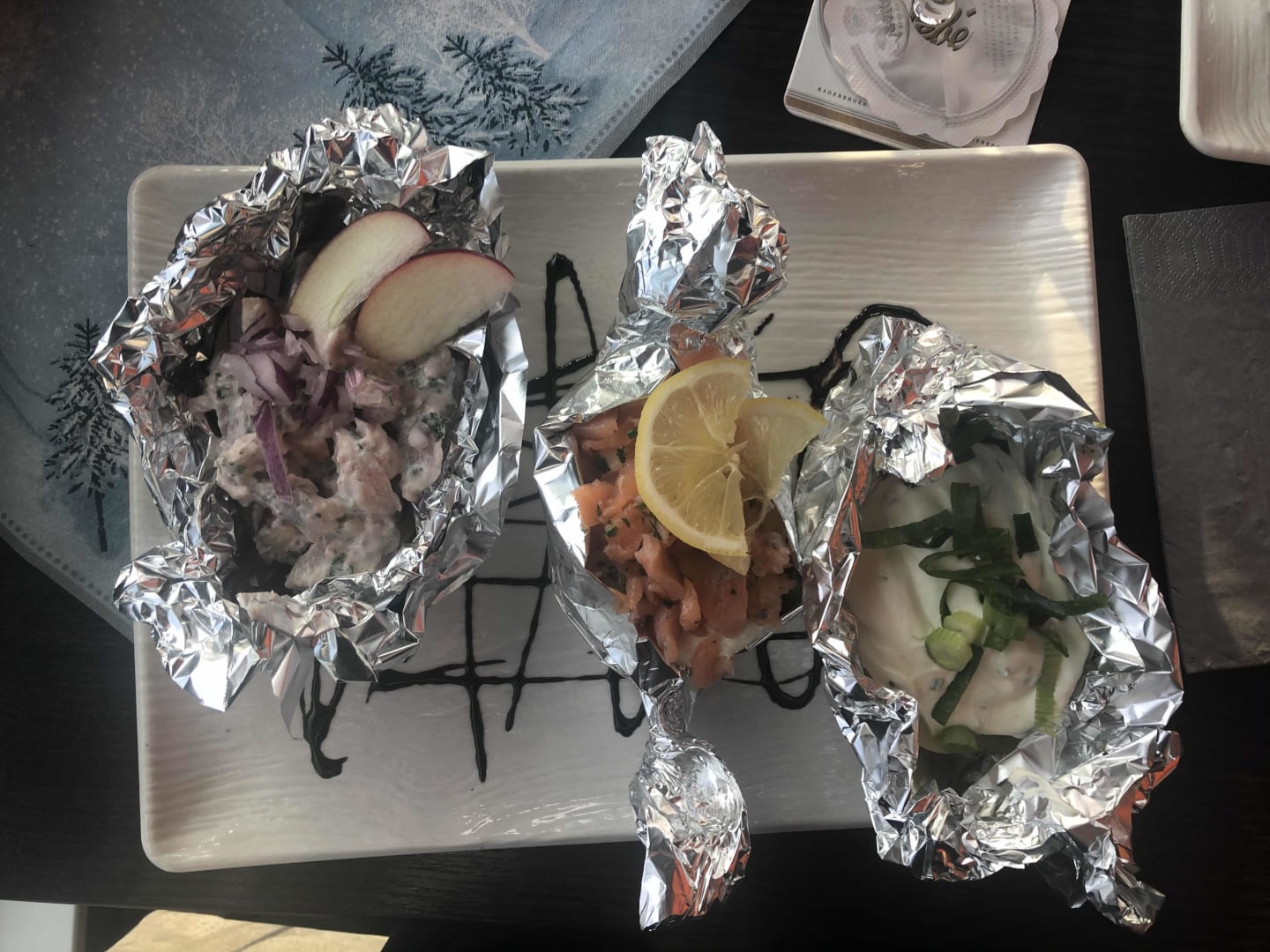 Snack am Mittag in der Bar.3 leckere Ofenkartoffel mit Lach-undMatjedtatar und Sourcreme für 8.50!