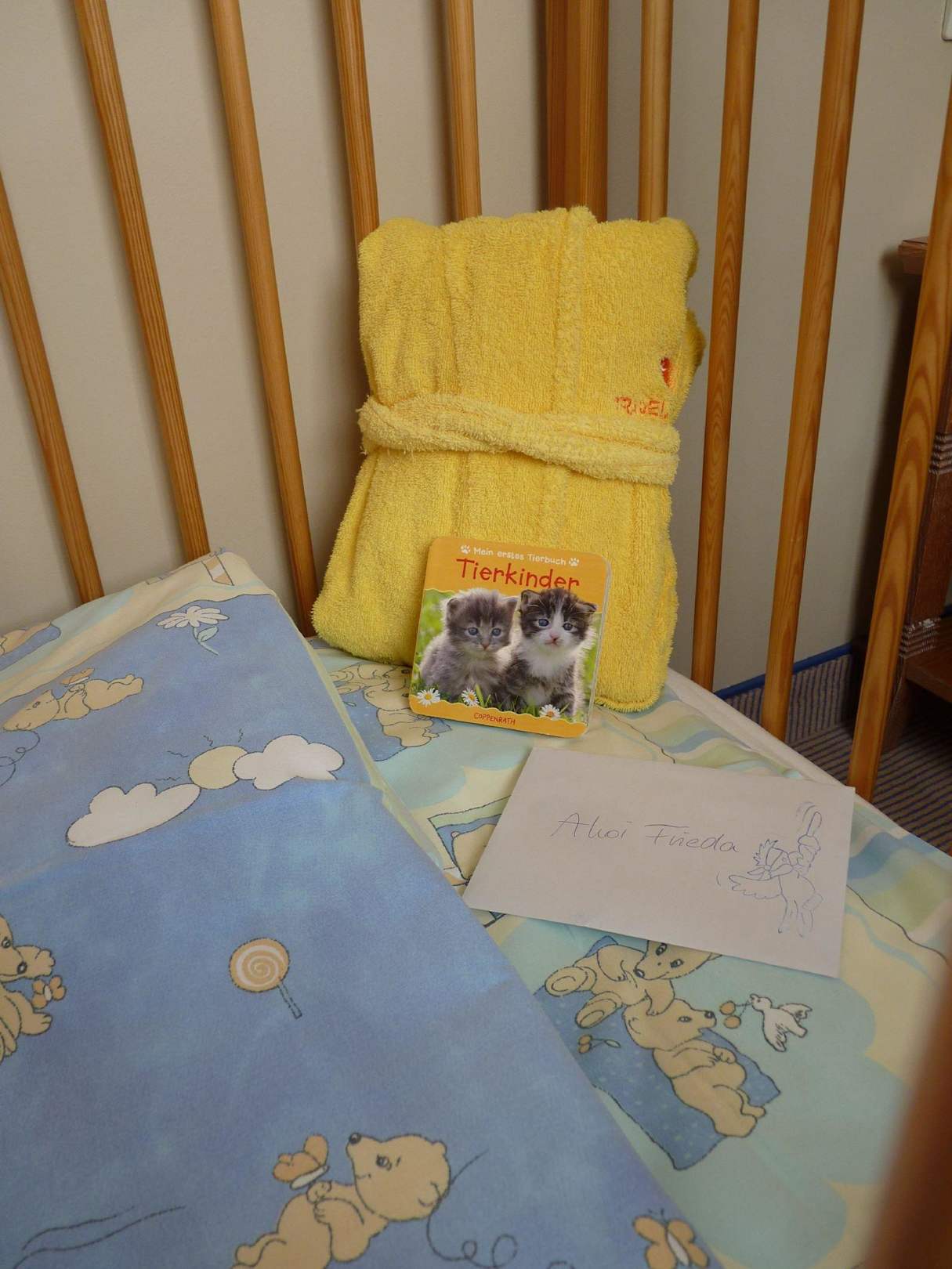 Kinderbett mit Bademantel und Begüßungspost