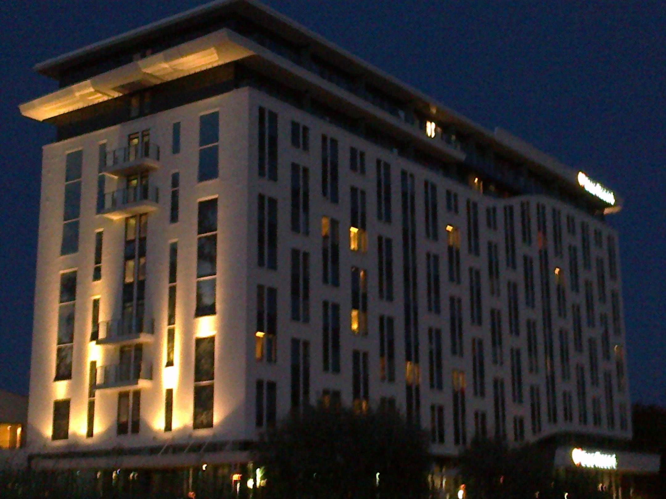 Blick vom Strand auf das Hotel am Abend