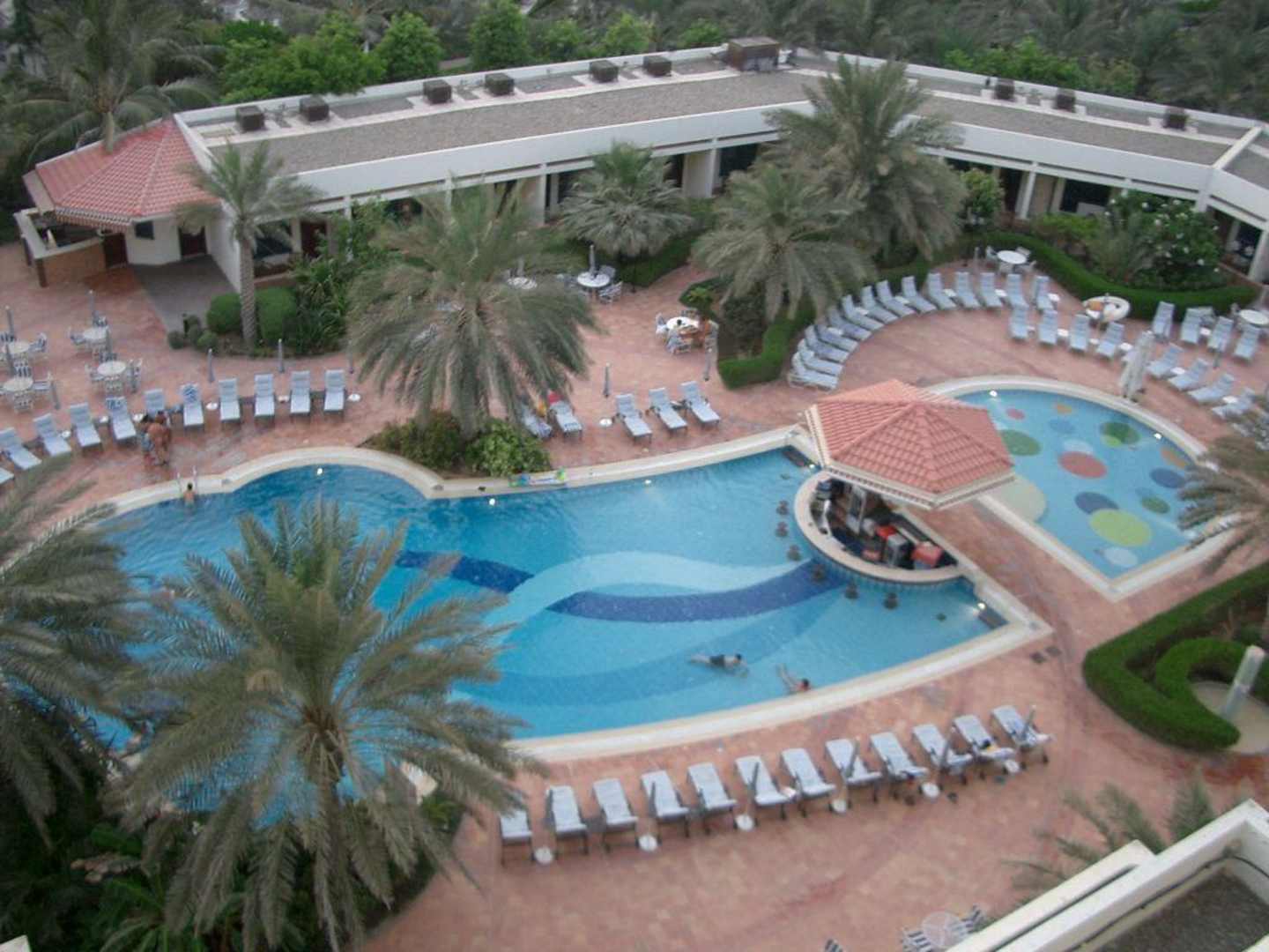 Poollandschaft des Ajman Kempinski am späten Nachmittag.