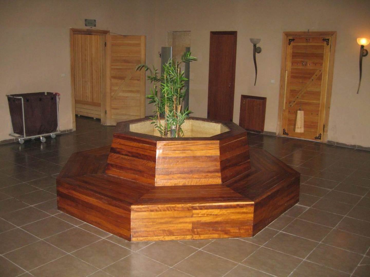 Zwischenraum mit Brunnen im Wellnessbereich.