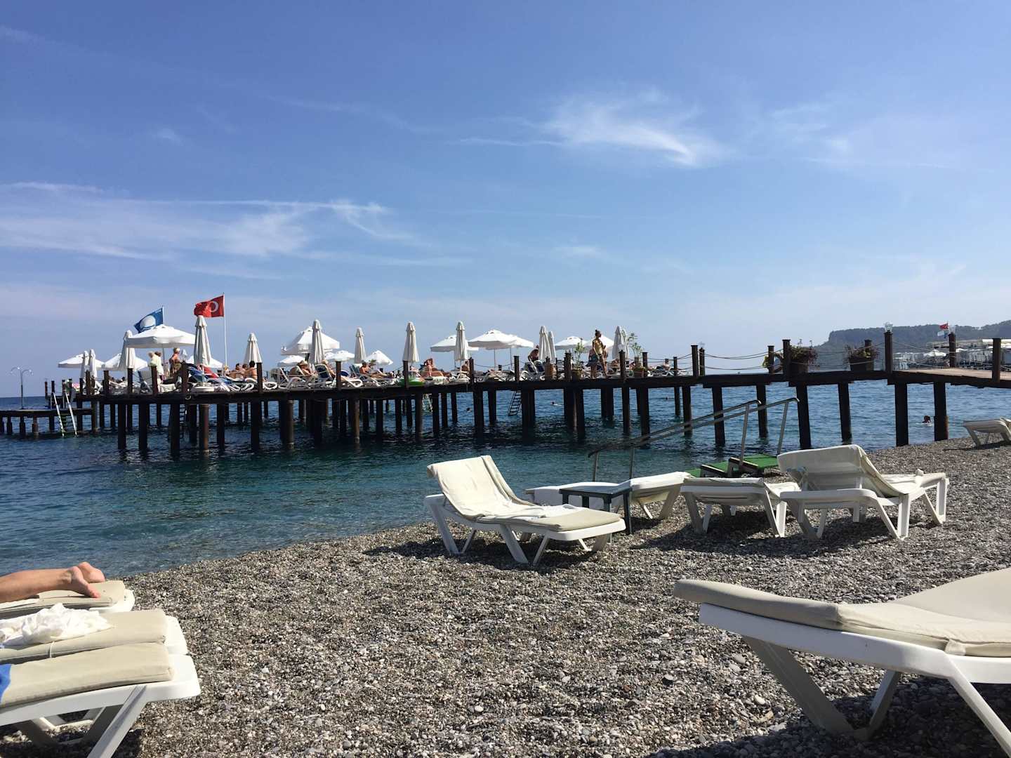 Kieselstrand mit Blick auf den Steg