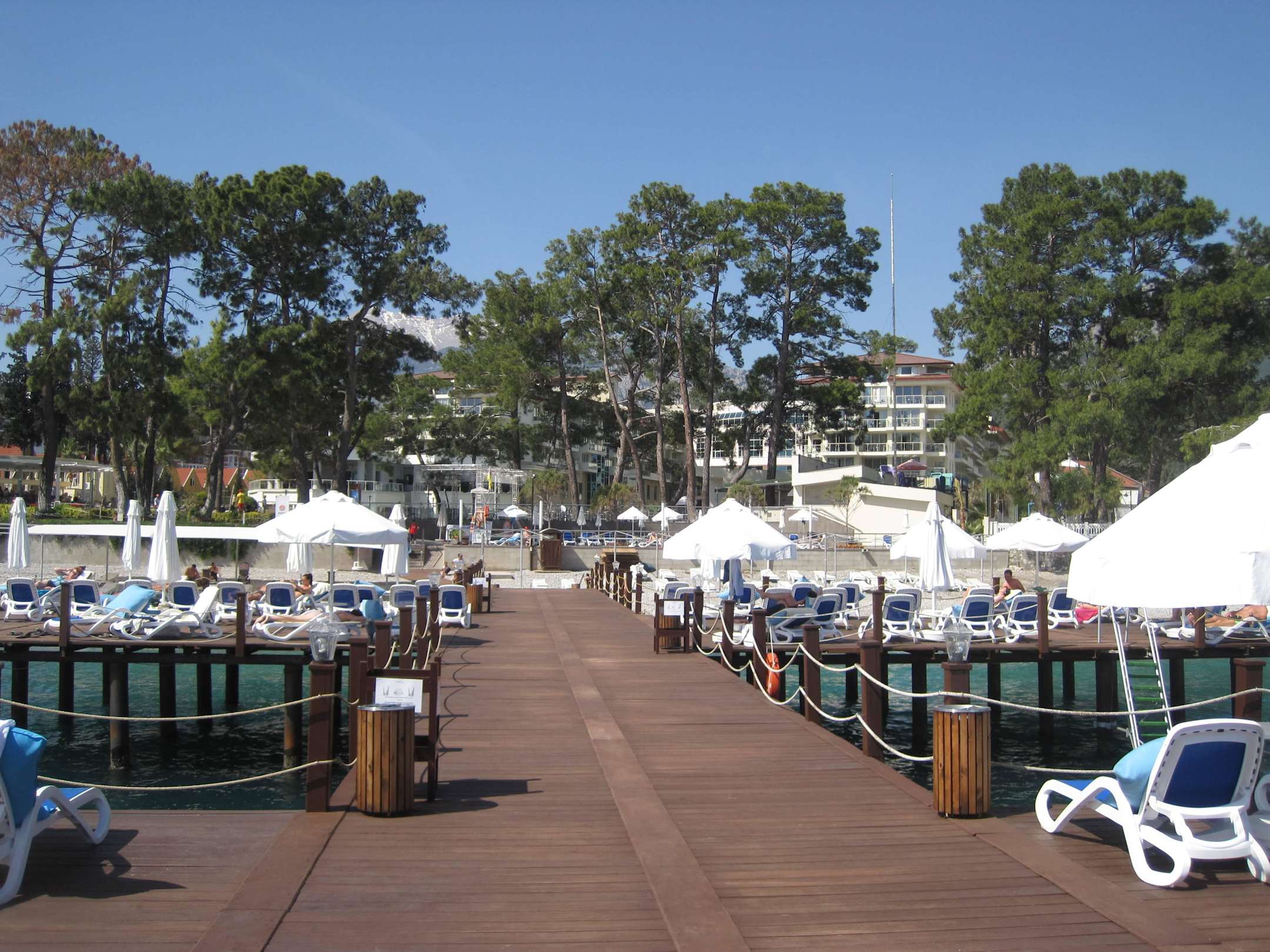 Blick vom Strandsteg aufs Hotel