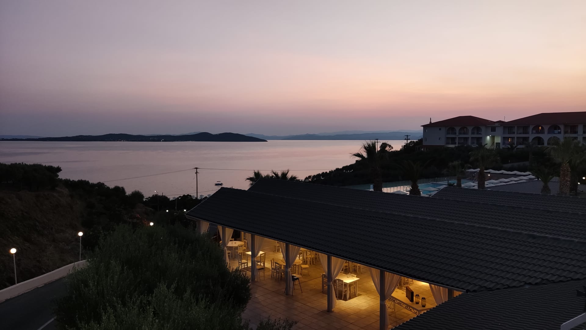 Taverne und Poolbereich am Abend