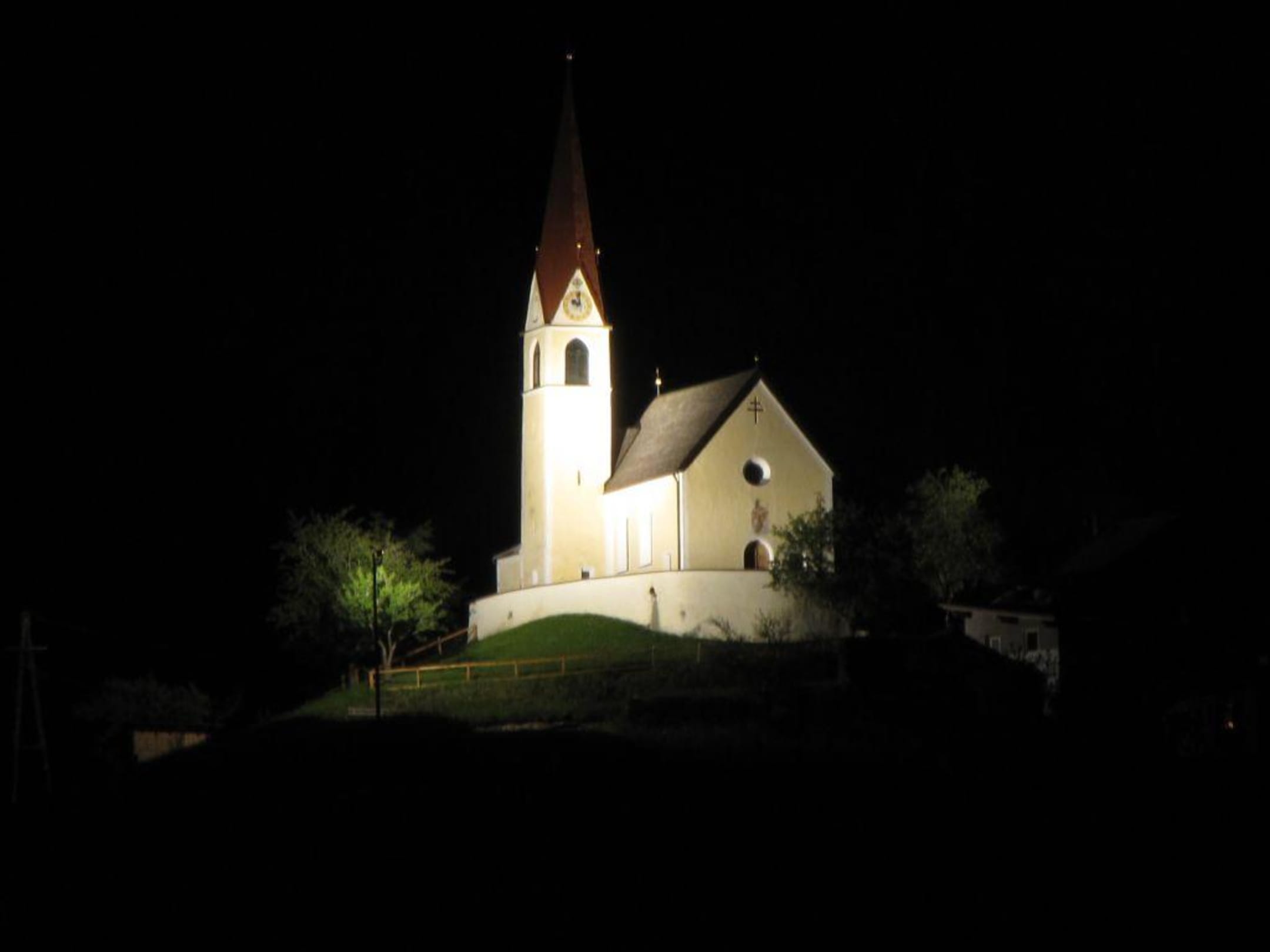 Blick vom Balkon auf die Kirche von Ötzerau bei Nacht mit 80x zoom