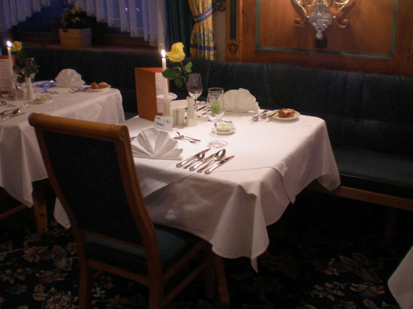Vor dem GaladinerGeschmackvoll und dem Anlaß entsprechend eingedeckter Abendtisch, denn 1 x wöchentlich gibt´s ein 6 - gängiges Galadiner