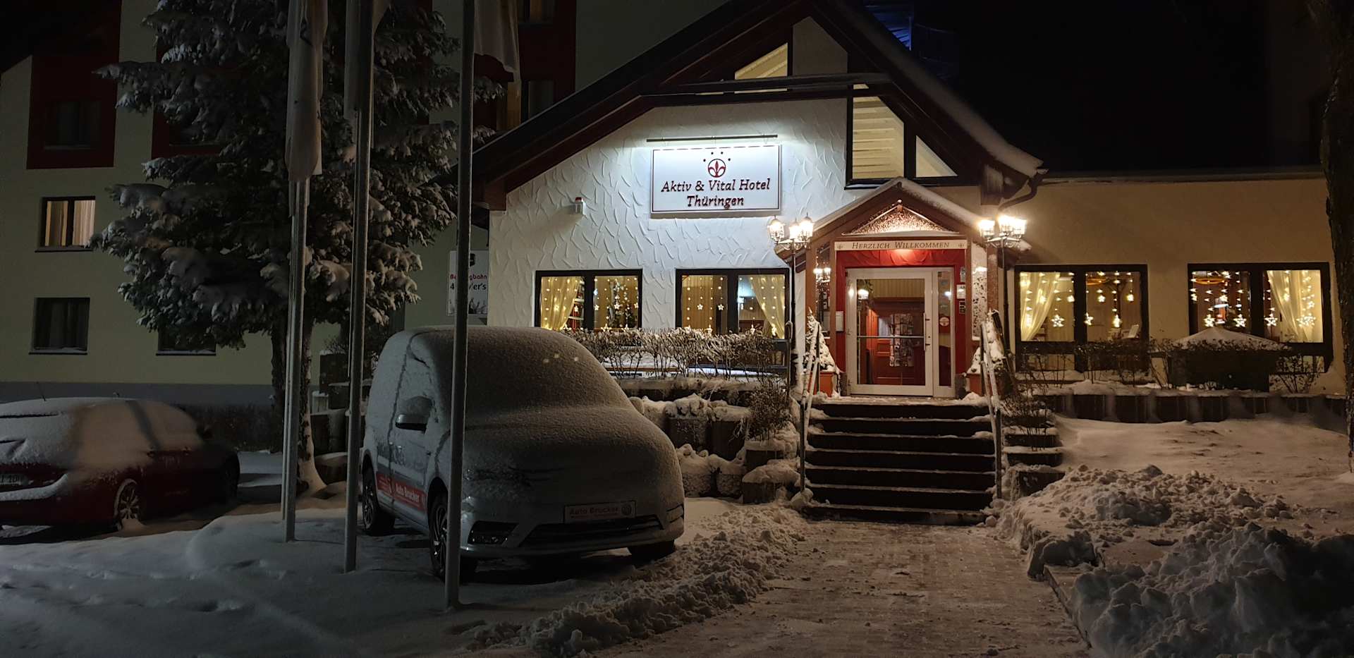 Hotel im winterlichen Abendglanz
