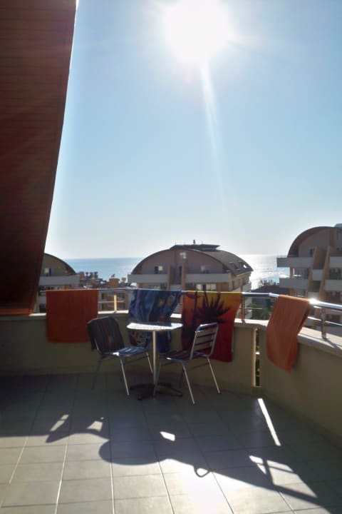 Balkon mit Sicht Pool, Meer, Strasse
