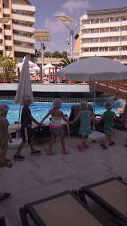 Rundgang der Kinder nach dem BackenGrosses Kompliment auch,an den Teamchef vom Kid's Club. Jeden Tag mit so einem engament an die Sache gehen,von früh am Morgen bis spät am Abend verdient grossen Respekt. Die kinder vom Kid's Club nach dem Pizza backen beim Rundgang um den Pool
