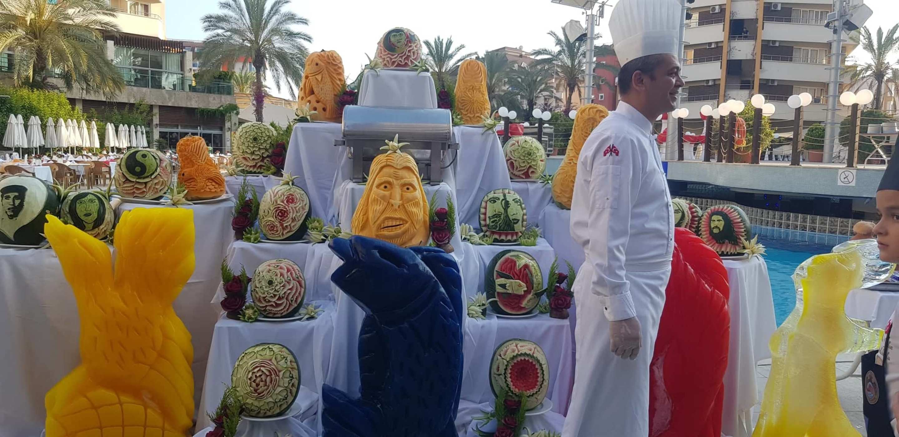 schöne geschnitzte Melonen und Eisskulpturen