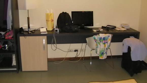 Einzige Ablagemöglichkeit im Zimmer. Kühlschrank klein aber ok.