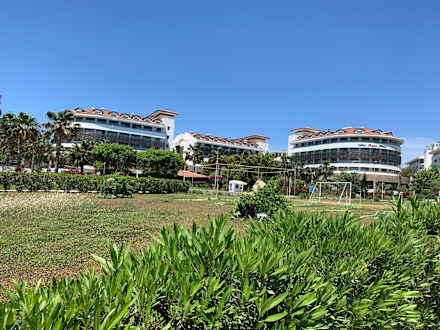 Das Hotel vom Strand aus… links das Alba Royal Resort