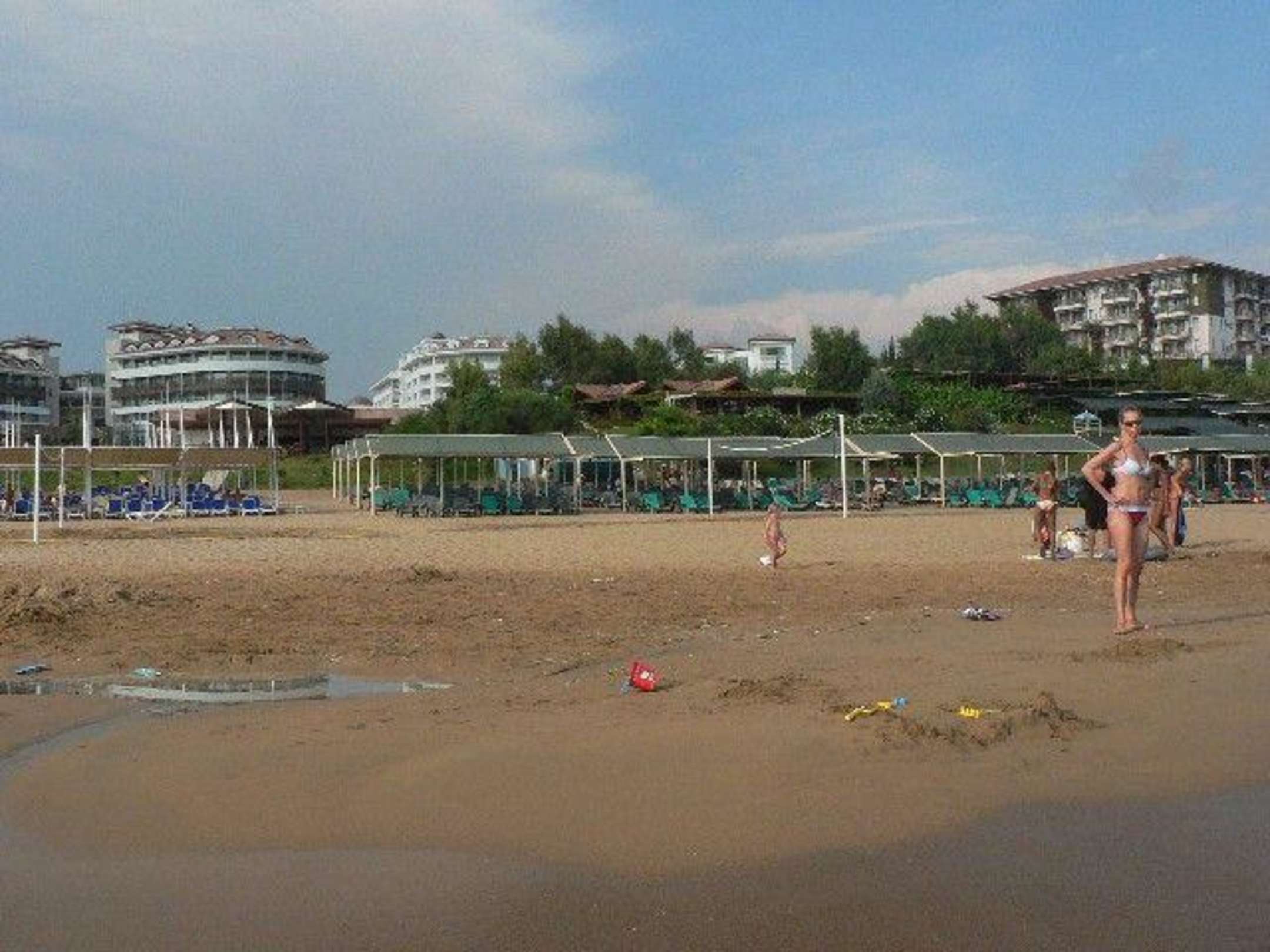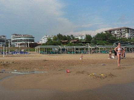 Alba Queen StrandDie weiß-blauen Liegen links gehören zu den Alba Hotels, die grünen Liegen auf der rechten Seite gehören zum Hotel Stone Palace. Im Hintergrund links ist das Alba Royal zu sehen, rechts das Defne Dream. Das Alba Queen ist das weiße Hotel hinter den Büschen.