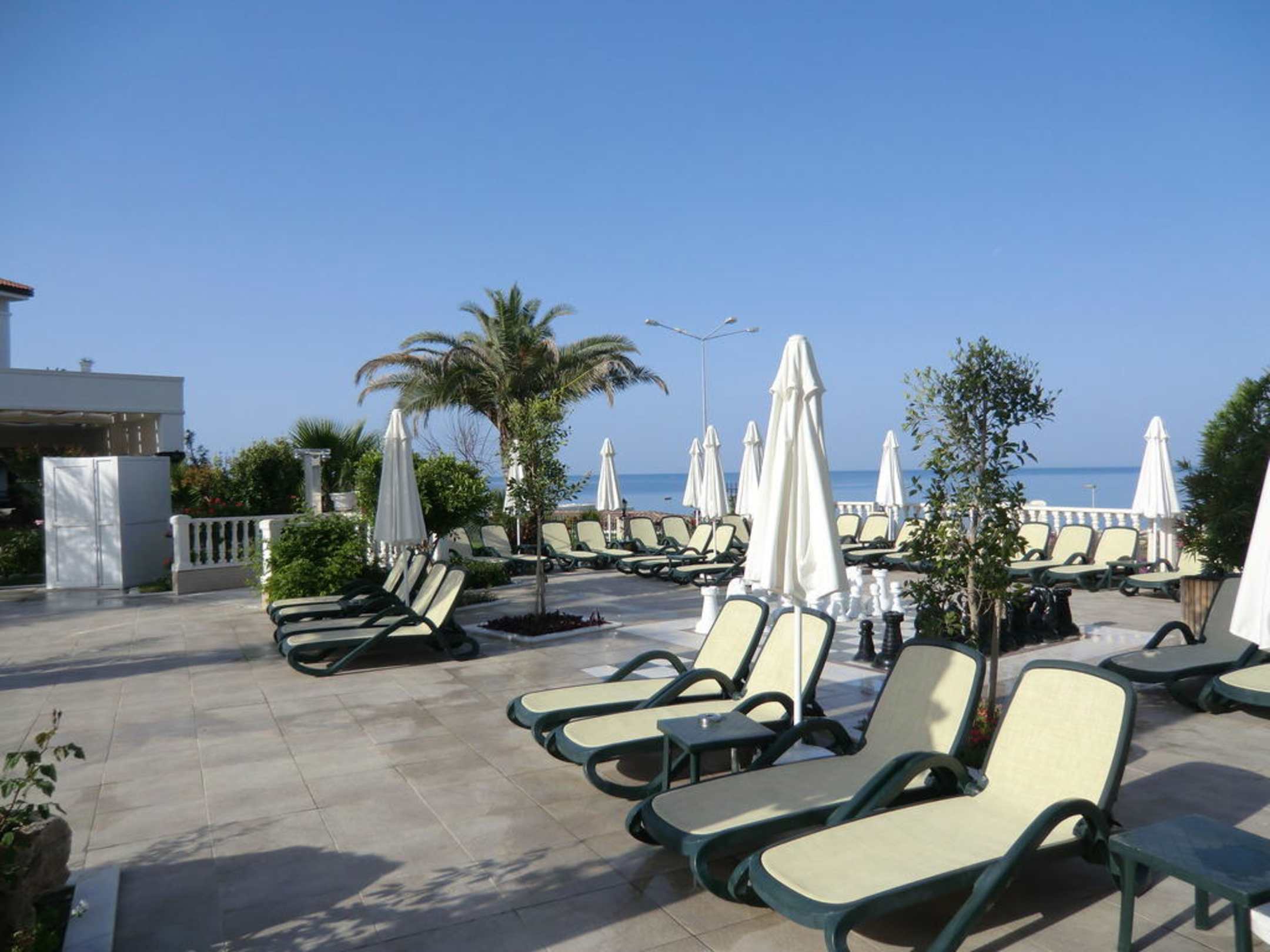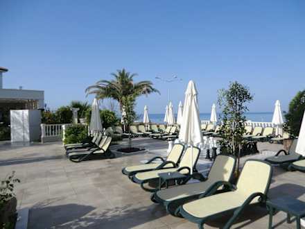 Dies ist ein Blick zum Pool mit Hintergrund Mittelmeer