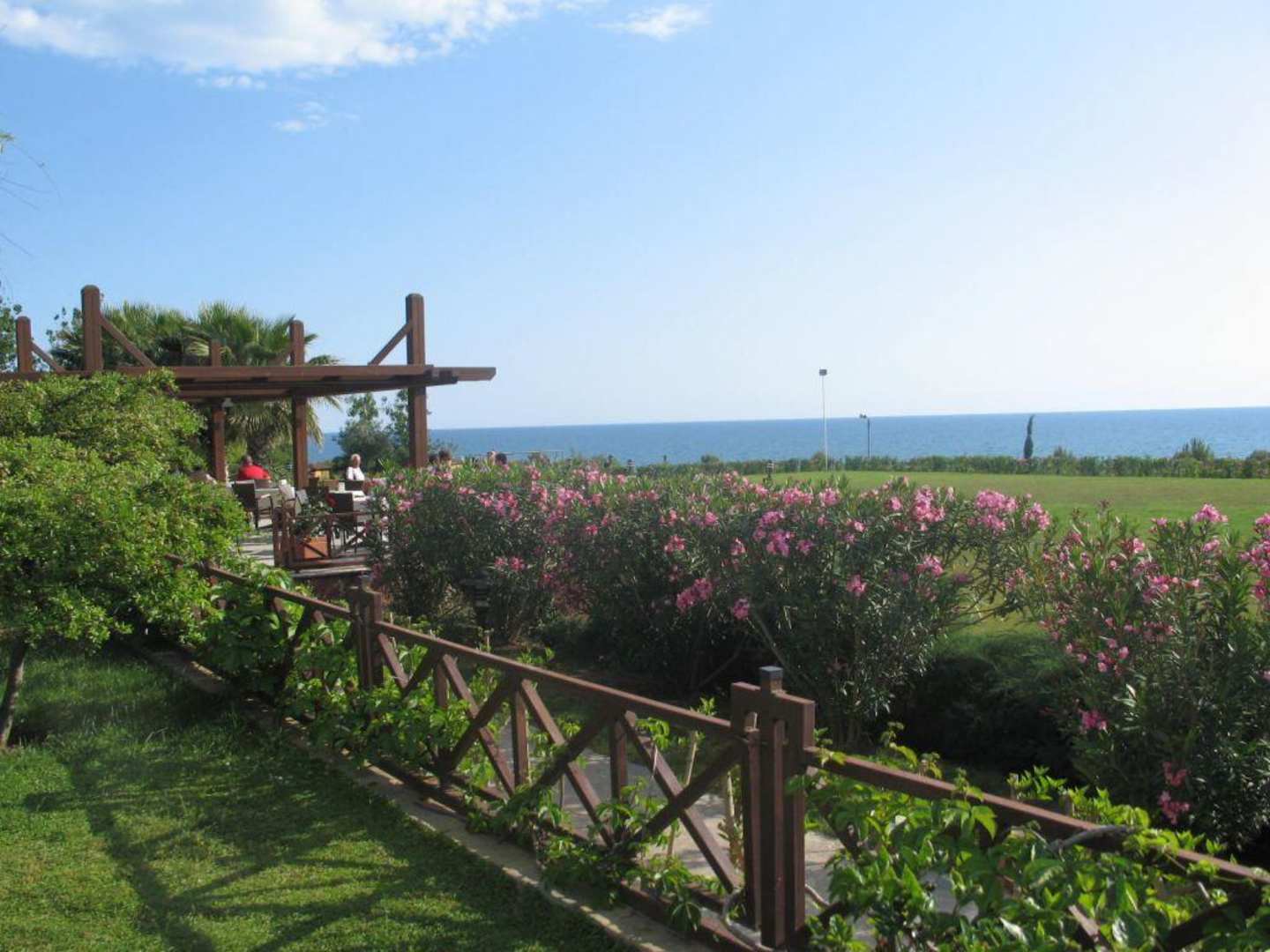 Blick auf die Sonnenterrasse der Poolbar über Park und Fußballfeld aufs Meer