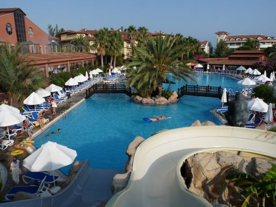 Blick von den Wasserrutschen auf den Pool