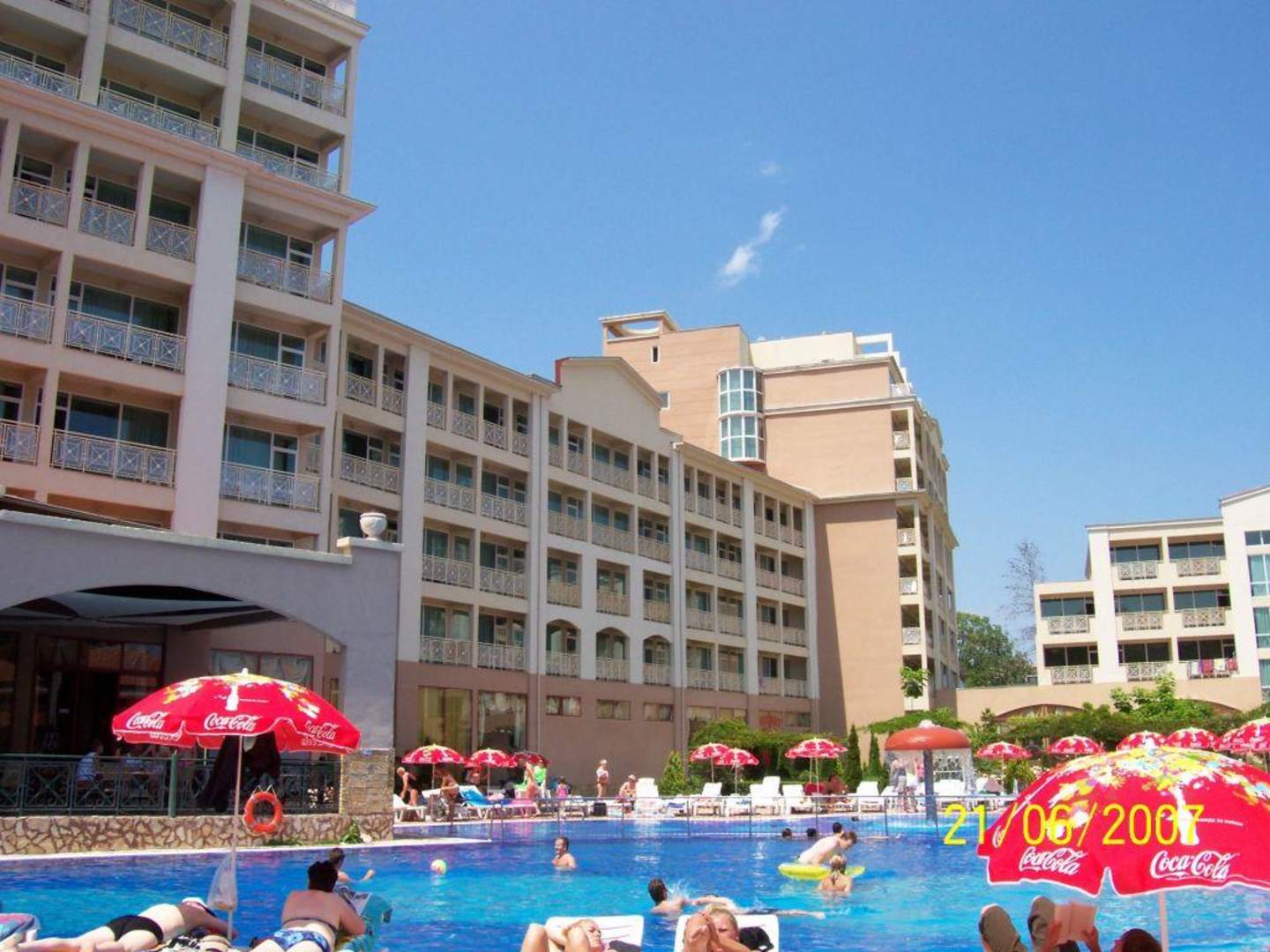 Die 5 Gebäude des Hotels sind L-förmig um den Schwimmingpool gruppiert. Links im Bild 3 Gebäude, vorne im Bild eines der beiden anderen Gebäude