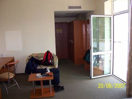 Die Doppelzimmer sind weiterhin mit Fernseher, Tisch, Sesseln, Kühlschrank, Bad und Balkon ausgestattet. Hier der Blick von den Betten in Richtung Bad (links) und Balkon (rechts).
