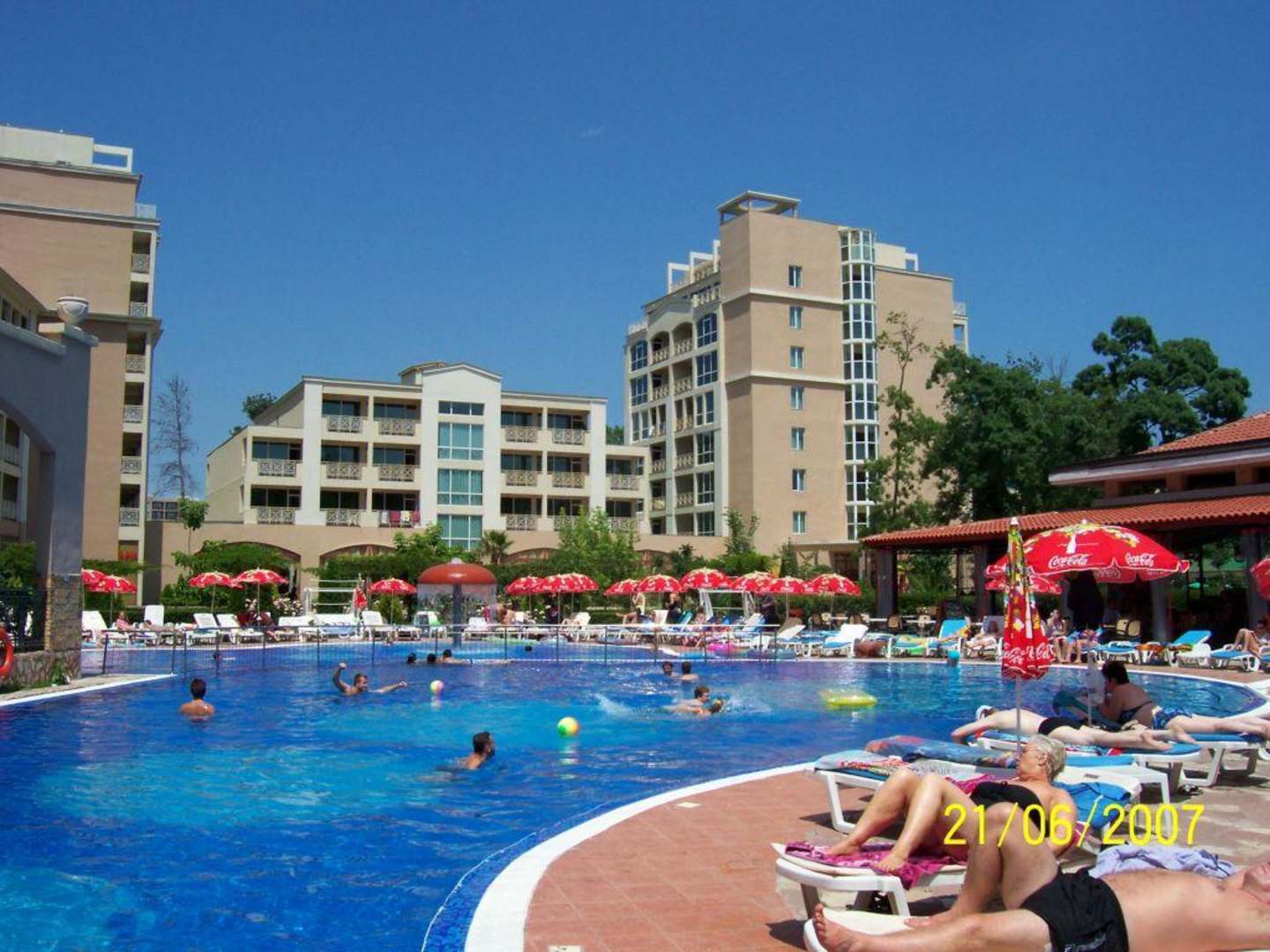 Schwimmingpool und GebäudeDie 5 Gebäude des Hotels sind L-förmig um den Schwimmingpool gruppiert, links im Bild 3 Gebäude, vorne im Bild 2 Gebäude