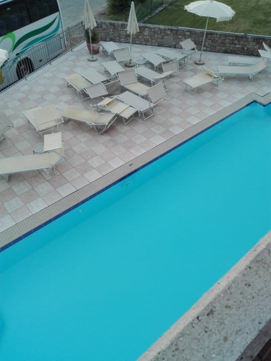 Blick vom balkon auf den pool.