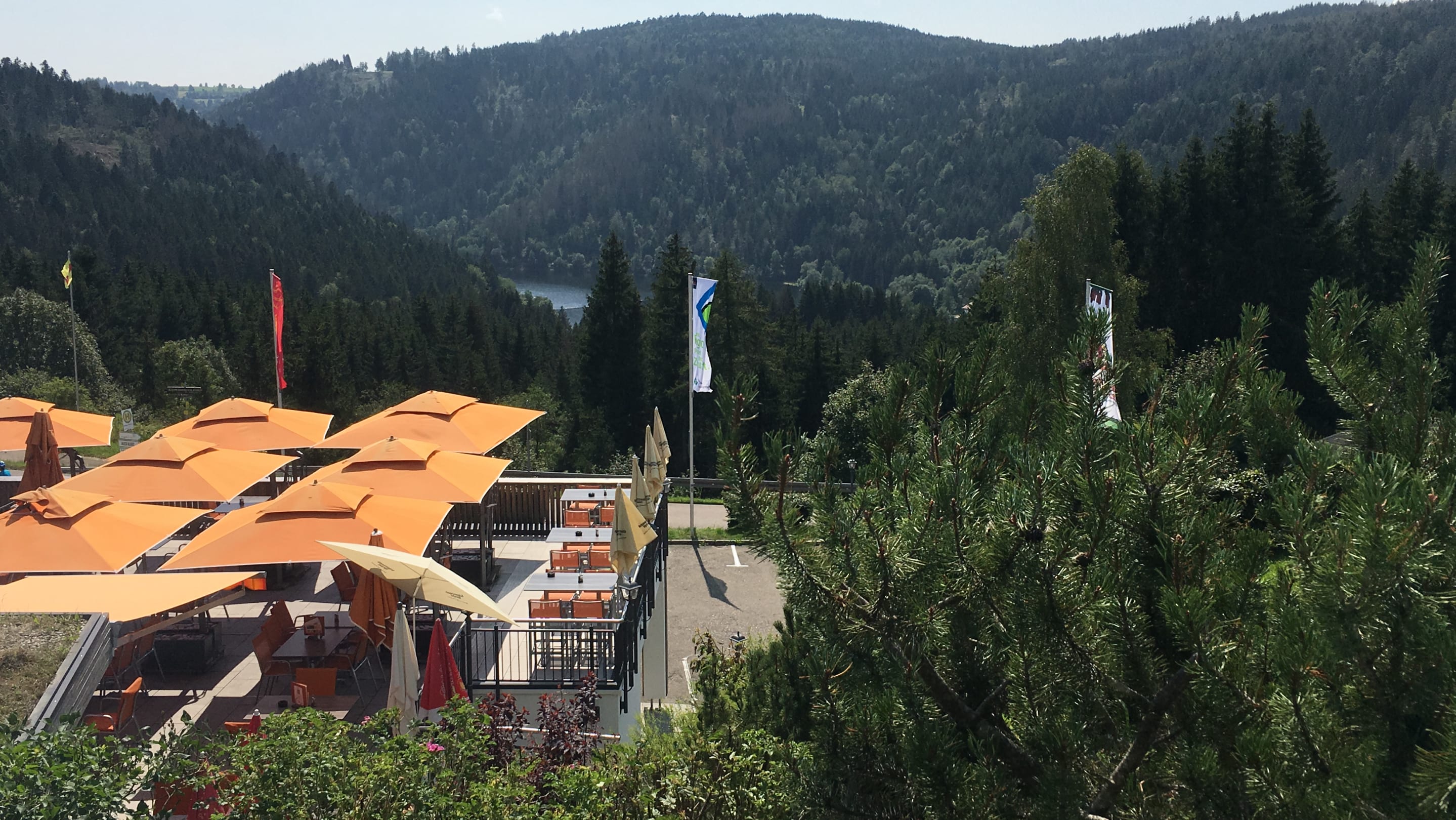 Blick von der Terrasse vor dem Hallenbad auf die Restaurantterasse und den Albsee.