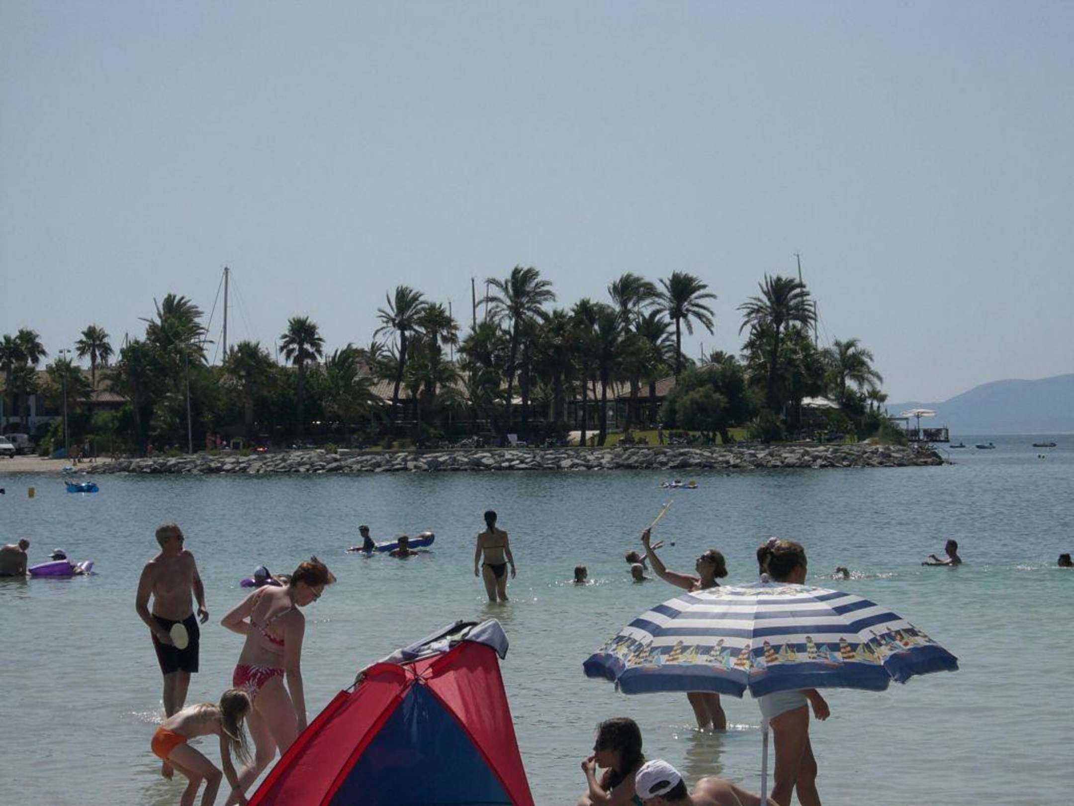 Blick vom Strand zum Meer mit MoleVom Strand sieht man hinüber zur Mole wo ein Botel ist. Dort ist jedoch der Strand nicht so schön.