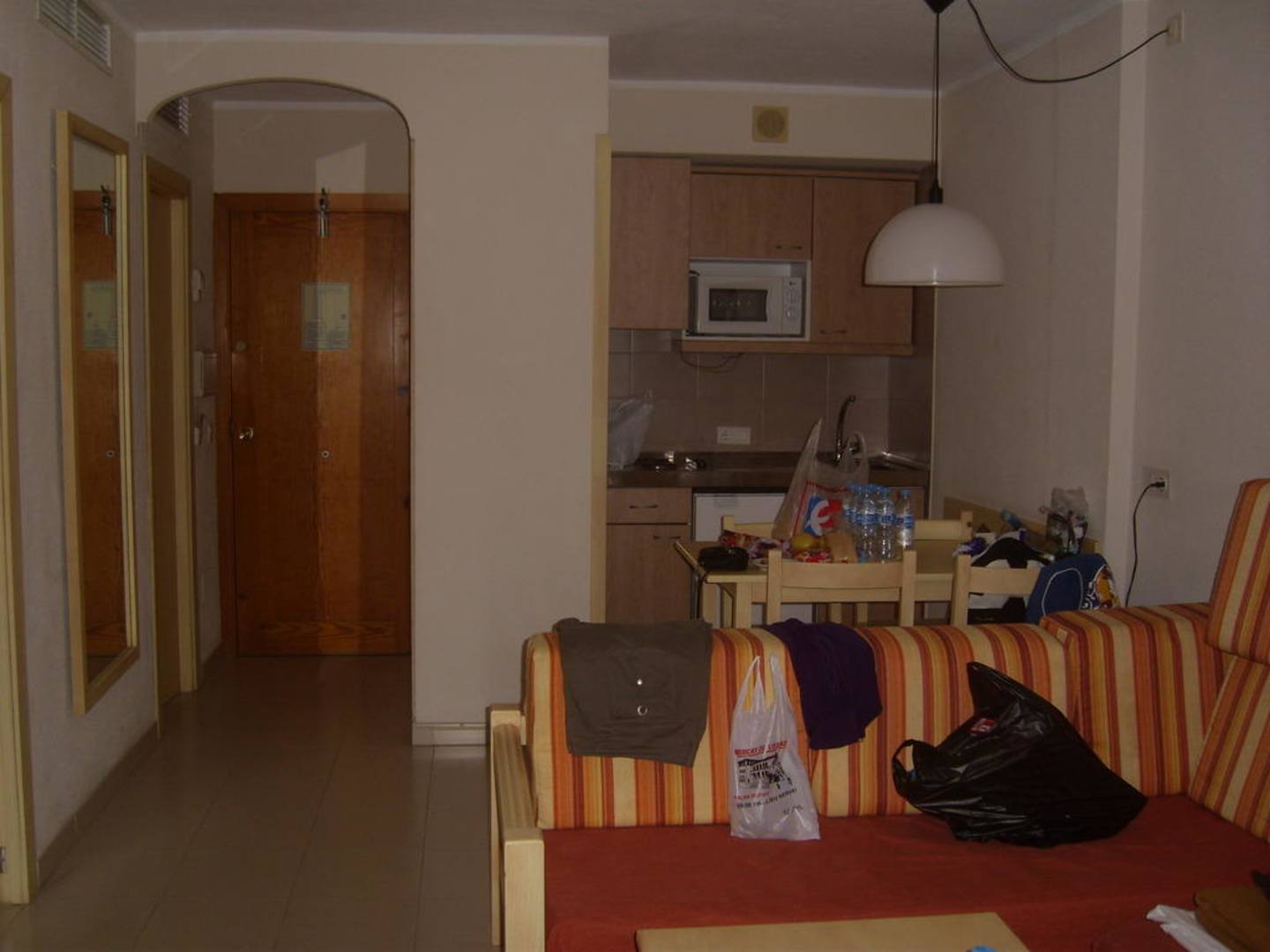 Blick vom Balkon ins Zimmer. Mit Küche, Wohnzimmer und Eingangstüre.
