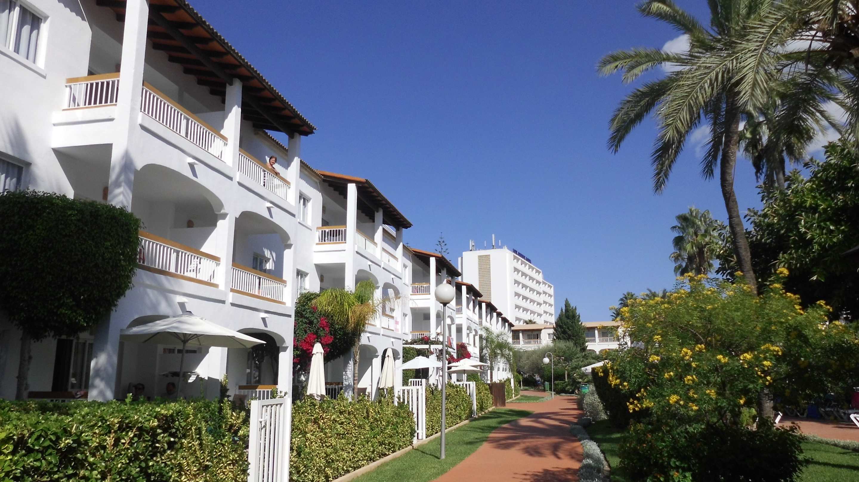 Außenansicht3-geschossige gepflegte Bebauung mit Pool-und Gartenblick im Innenhof des Hotels "Alcudia Garden" in Port d´Alcudia