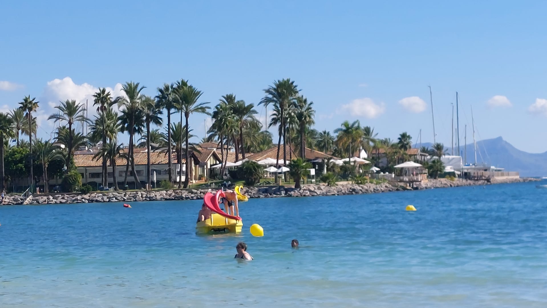 AußenansichtBlick vom öffentlichen Sandstrand der Alcudia-Bucht hinüber zum Botel-Hotel. Man könnte meinen, es liegt auf einer tropischen Insel...