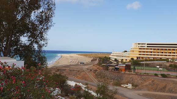 Seitenausblick vom Garten zum Strand und in Entfernung zum Hotel Iberostar Gaviotas nebenan.