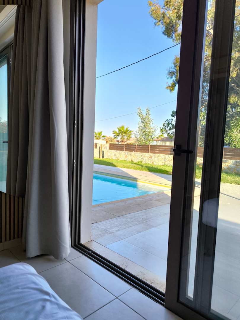 Aussicht vom Bett auf den Garten mit beheiztem Privatpool
