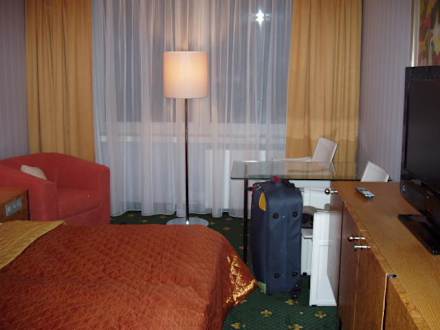 Blick zu großen Fensterlinks das Bett sowie der ausklappbare Sessel und rechts den Glastisch mit 2 Stühlen und Kommode mit Minibar und Fernseher