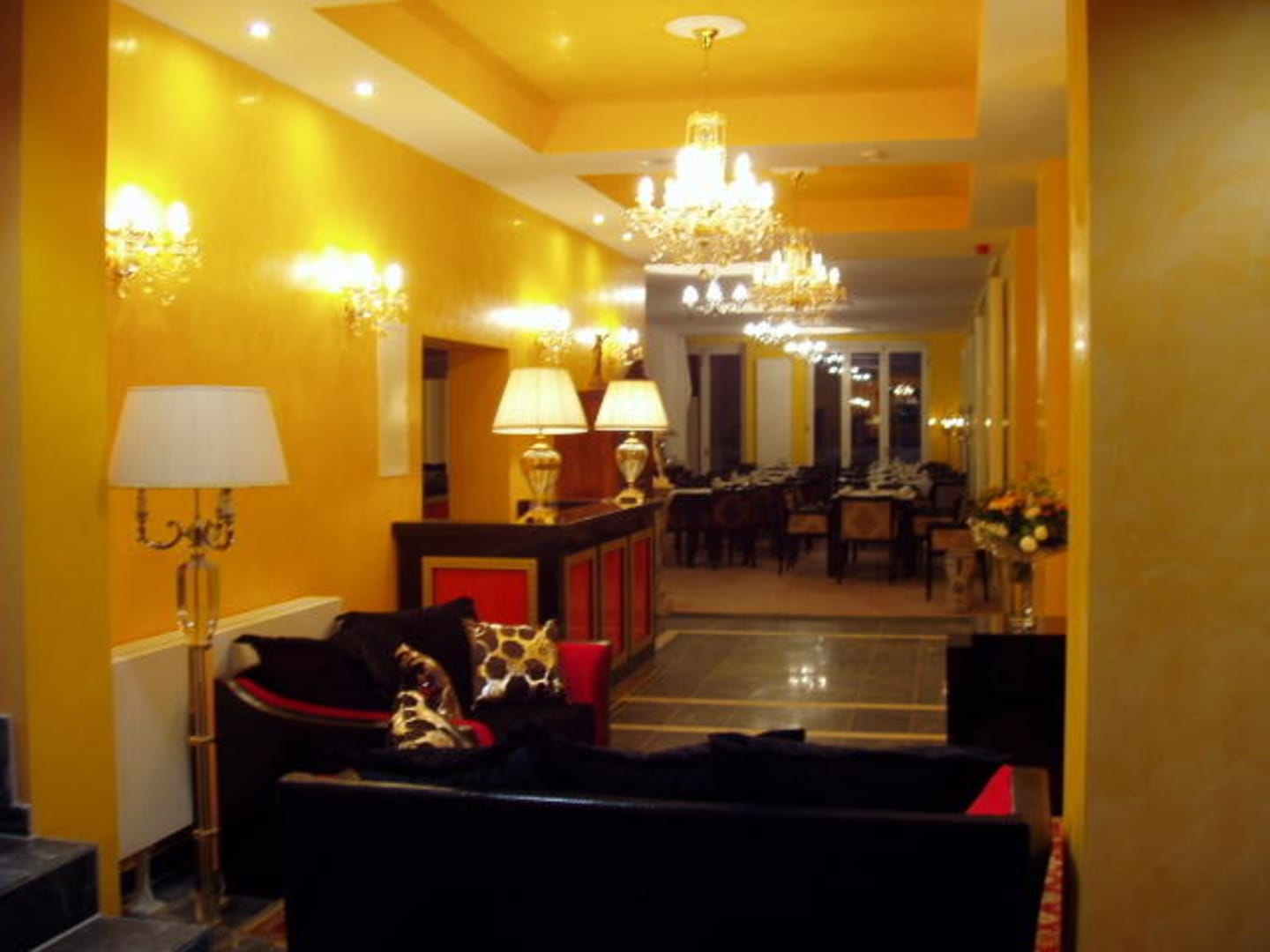 Blick vom Durchgang richtung Rezeption (links) und Frühstücksraum