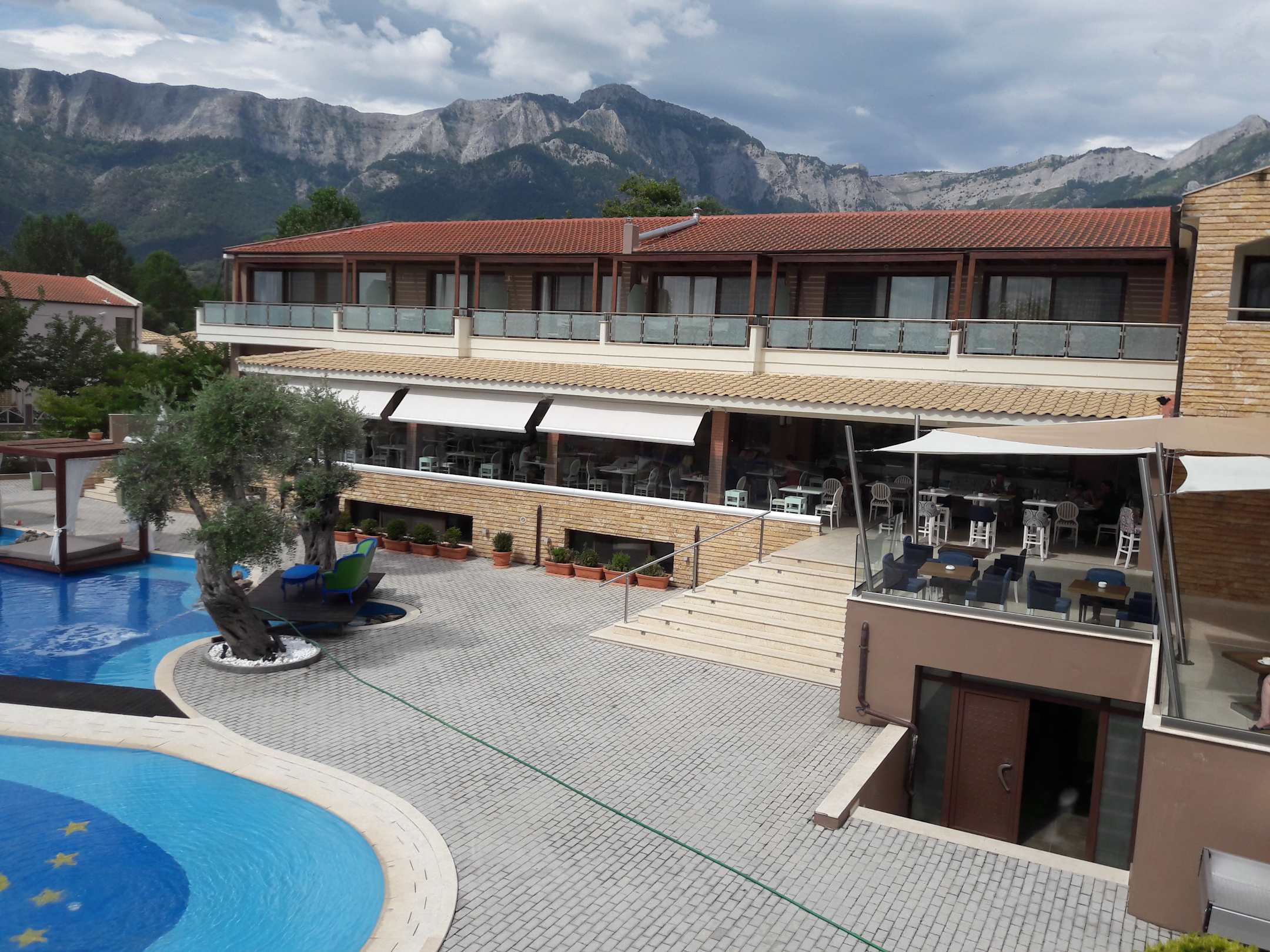Blick von Maisonette auf den Pool und das Restaurant