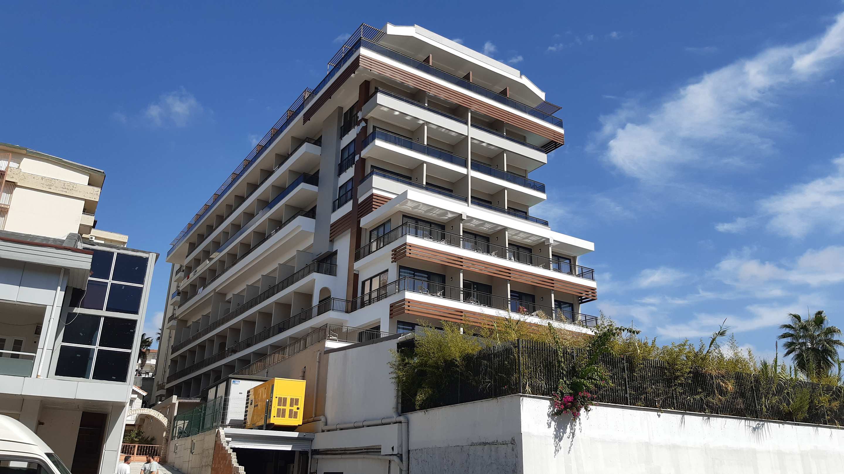 AußenansichtVon vorne (Eingang) gesehen ist das die rechte Seite vom Hotel, die Zimmer haben "seitlichen Meerblick" ab der Lobby-Etage-Etage.
