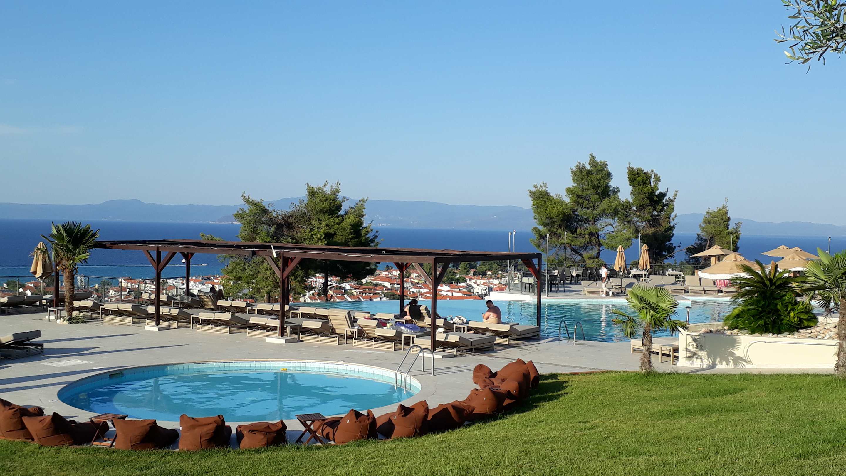 PoolRunder Kinderpool-Bereich mit braunen Sitzkissen. Dahinter viele Pool-Liegen und der große Infinity-Pool.