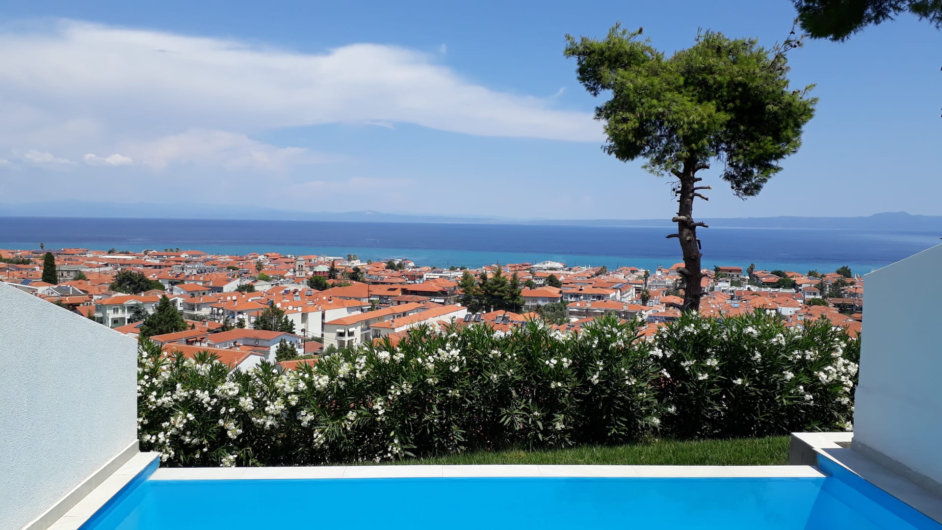 Privatpool von der Juniorsuite mit Panorama und Meerblick. Aussicht auf Pefkochori und das Meer.