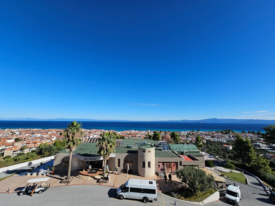 Ausblick auf Lobby, Rezeption und Restaurant, im Hintergrund der Ort Pefkochori