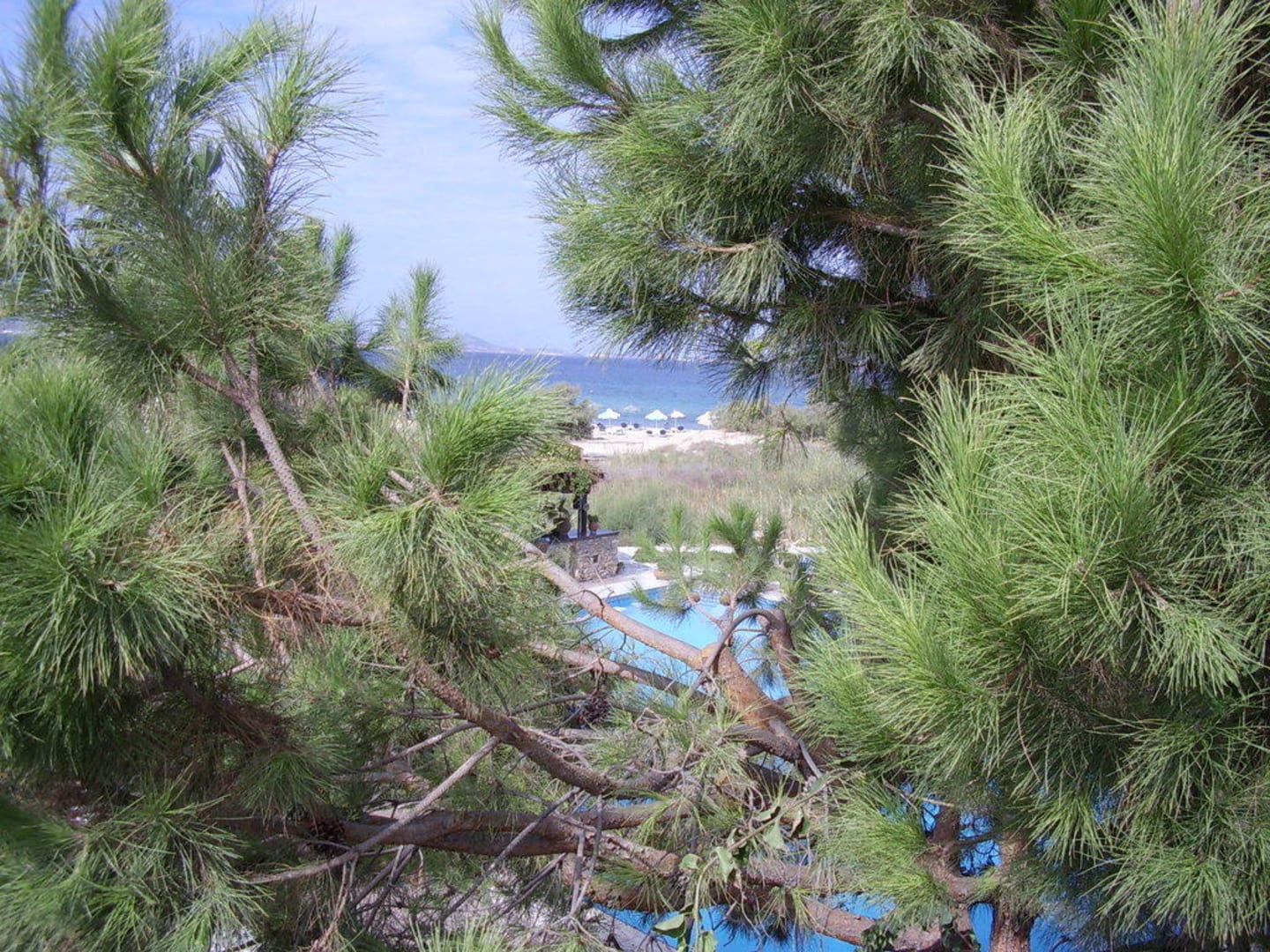 Blick durch die Pinien aufs Meer