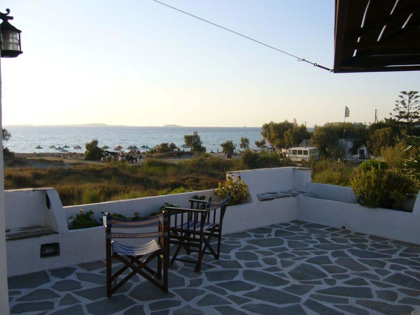 Der Ausblick zum StrandDer Strand ist nur einen Steinwurf entfernt, man hat einen tollen Blick bis hinüber nach Paros.