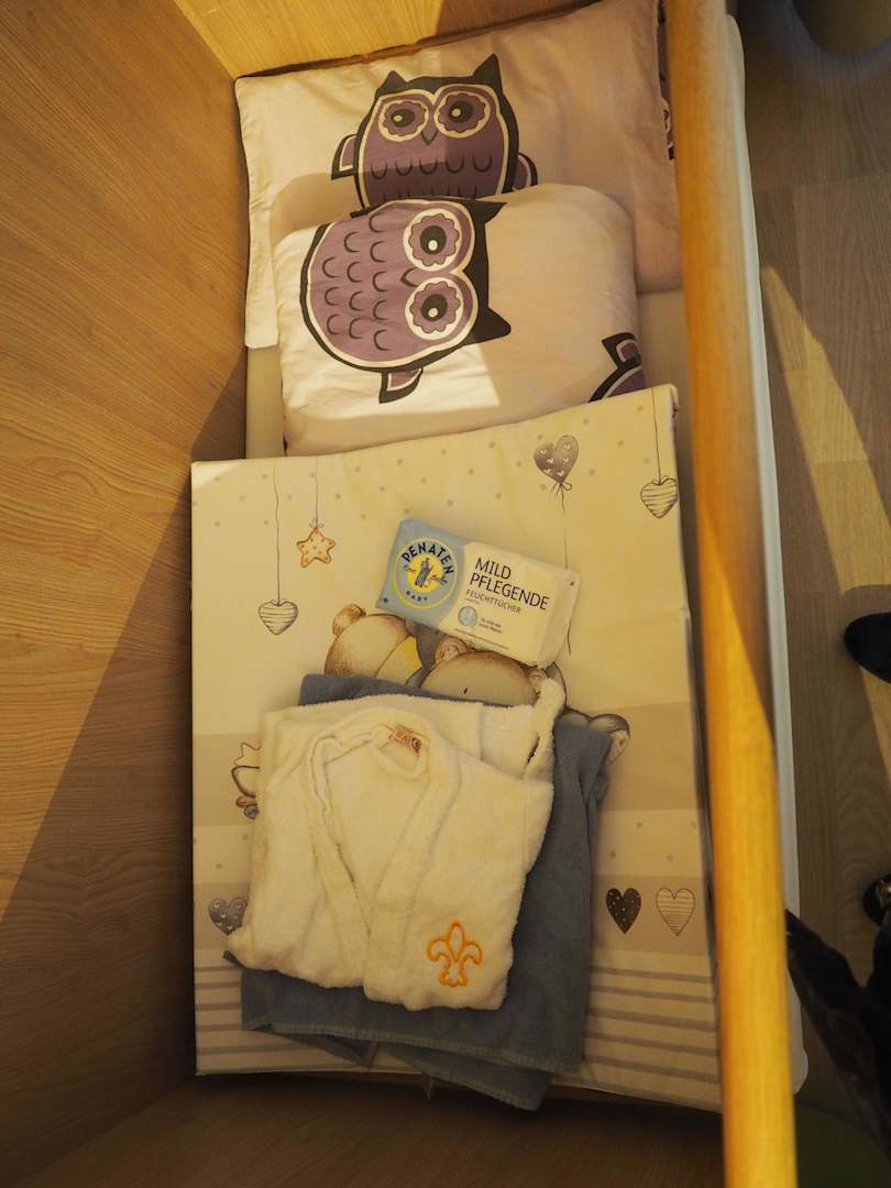 Wickelunterlage mit Feuchttüchern am Zimmer und ein Bademantel für die Kleinen