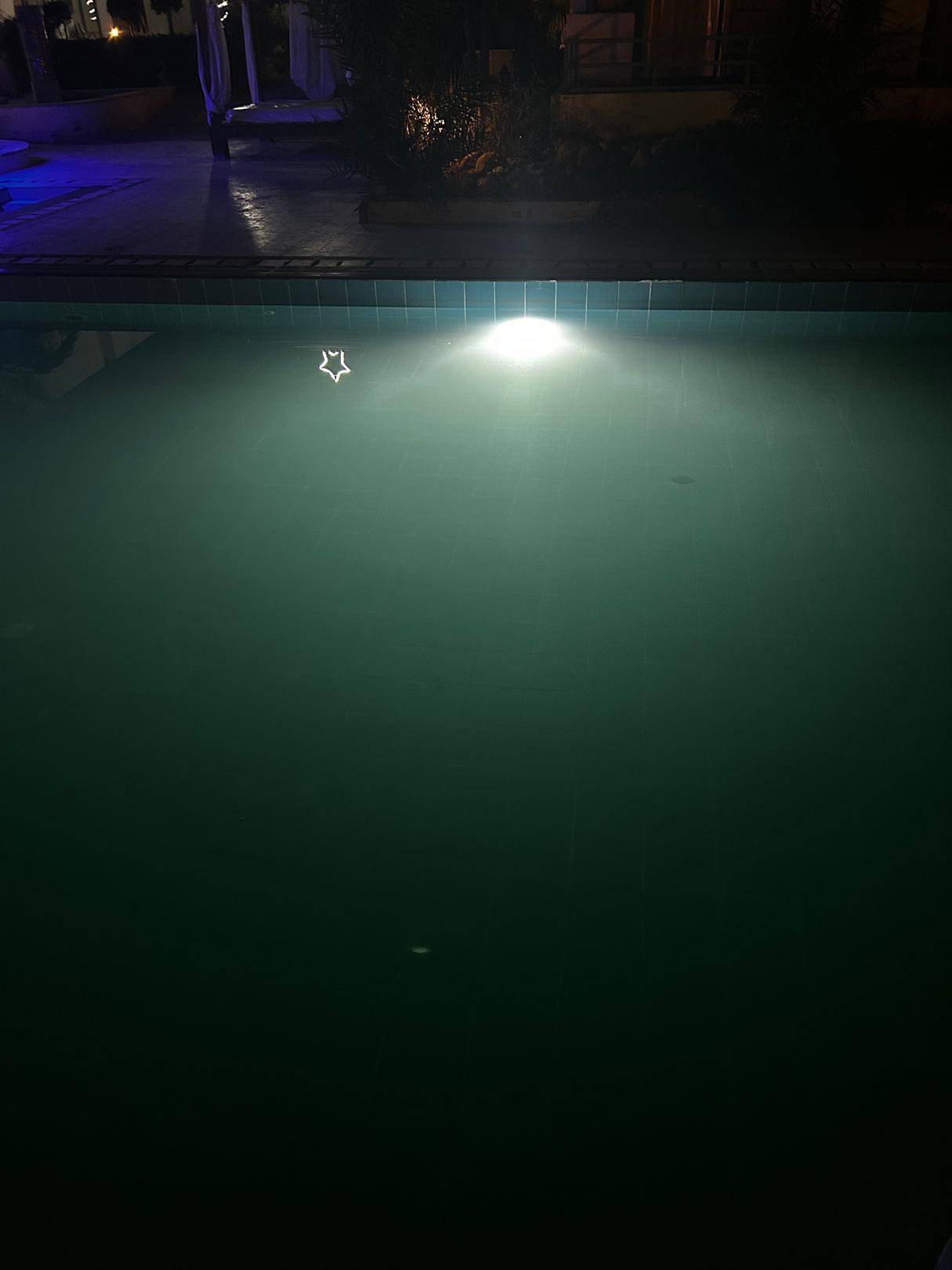Dreckiger Pool mit Beleuchtung an.